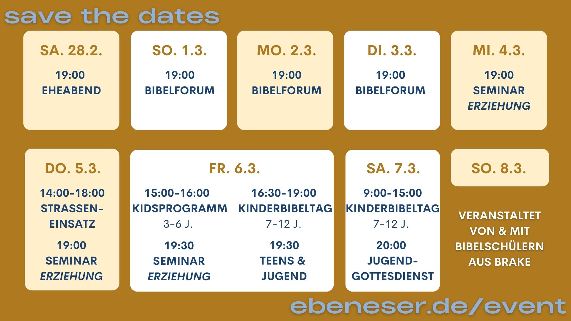 Vom 28. Februar bis zum 8. März werden wir eine Gruppe Bibelschüler aus Brake bei uns haben. Sie werden uns bei Gemeindeaktivitäten unterstützen und darüber hinaus weitere Events veranstalten. Für jeden wird etwas dabei sein.
